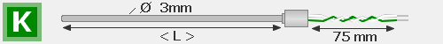 A Type K probe, made from half tolerance material with a 3mm diameter, 4, 5, 6, 7 and 8 metres long, Inconel sheathed with a plain pot seal and 75mm twisted pair 7/0.2 PFA insulated tails (bare lead ends without a plug).
